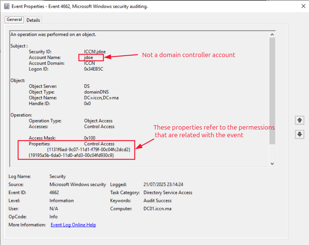 Detecting DCSync is easy because each Domain Controller replication generates an event with the ID 4662 . We can pick up abnormal requests immediately by monitoring for this event ID and checking whether the initiator account is a Domain Controller (all machine accounts in active direcory end with $). Here’s the event generated from earlier when we ran the impacket script ; it serves as a flag that a user account is performing this replication attempt: