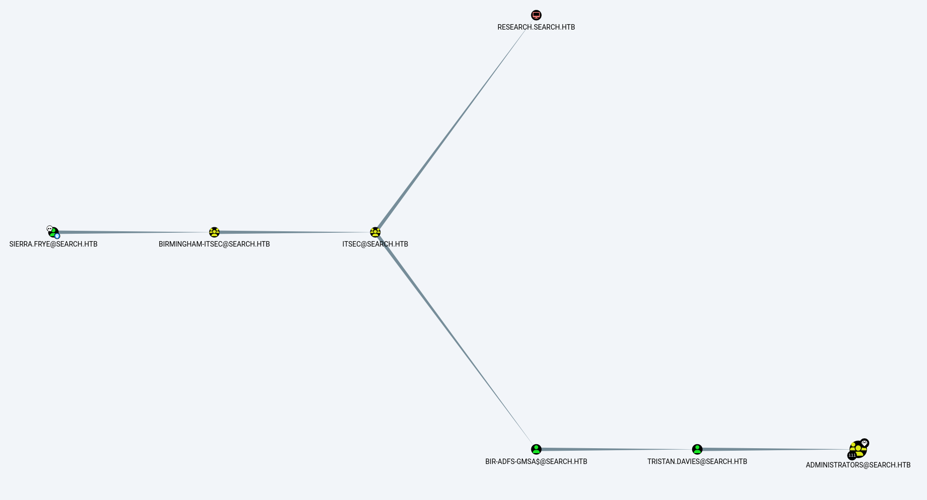 sierra.frye is a member of the ITSEC group, which has ReadGMSAPassword rights on the BIR-ADFS-GMSA$ group managed service account. This account, in turn, has GenericAll rights on tristan.davies ,which has DCSync rights on the domain.