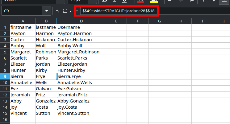 i opened the file with libreoffice, and it seemed that the c column is password protected, but using the name box and typing C9 i could see sierra.frye password :